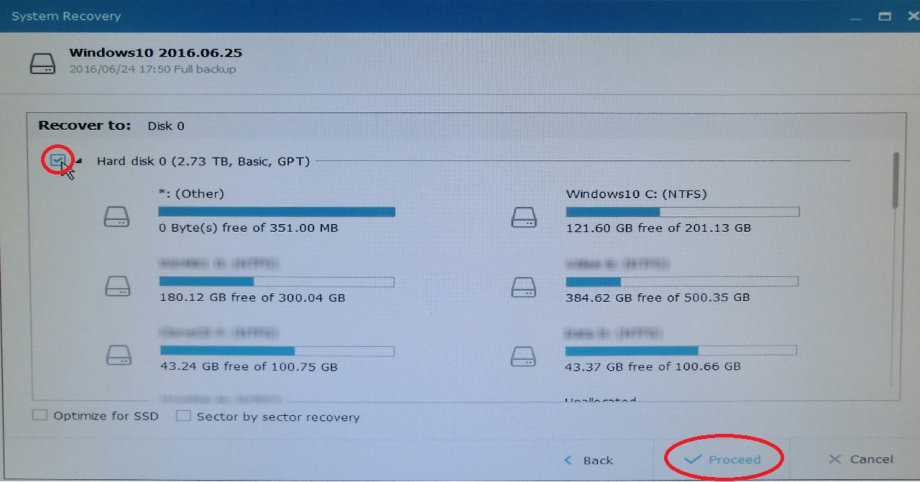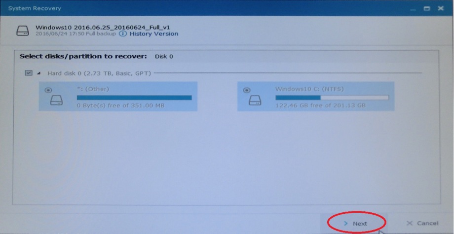 復元先の確認画面です。 復元するパーティションを含むハードディスクにチェックを入れて、