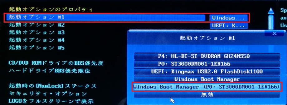 Biosの設定で、起動オプションの第一順位ををUSBメモリに設定します。 |