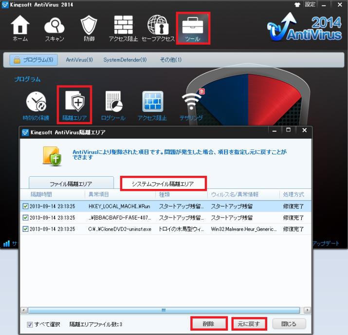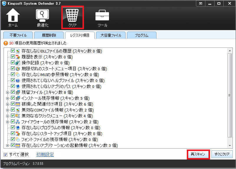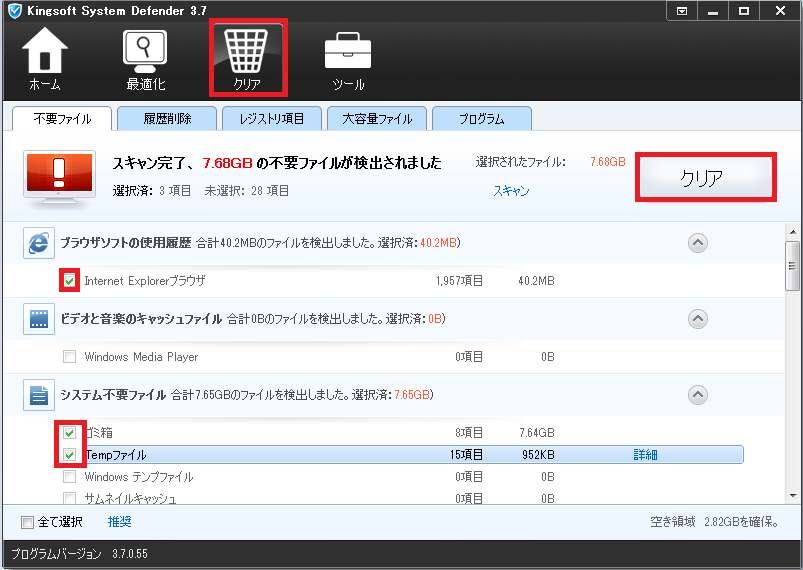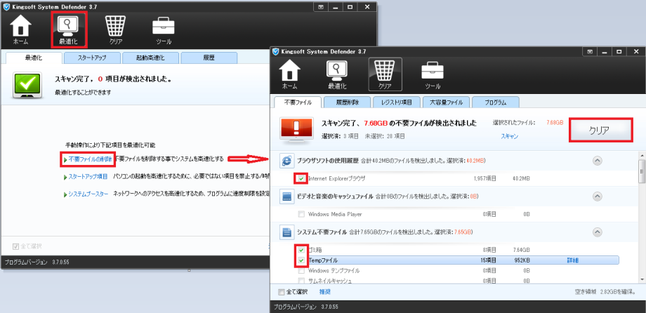 「最適化」タブで「スキャン」をクリックして、「不要ファイルの削除」「スキャン」をクリックすると不要ファイルが検出されます。不要であると思われる項目にチェックを入れて「クリア」をクリックします。 |