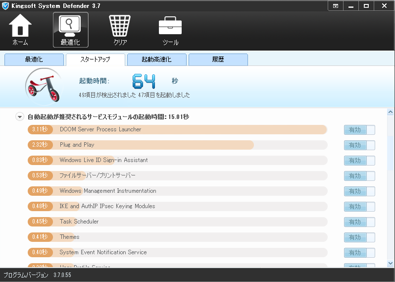 「最適化」タブの「スタートアップ」で自動起動プログラムを自動起動しないように設定することができます。これにより、スタートアップ時間を短縮することが可能になります。 |